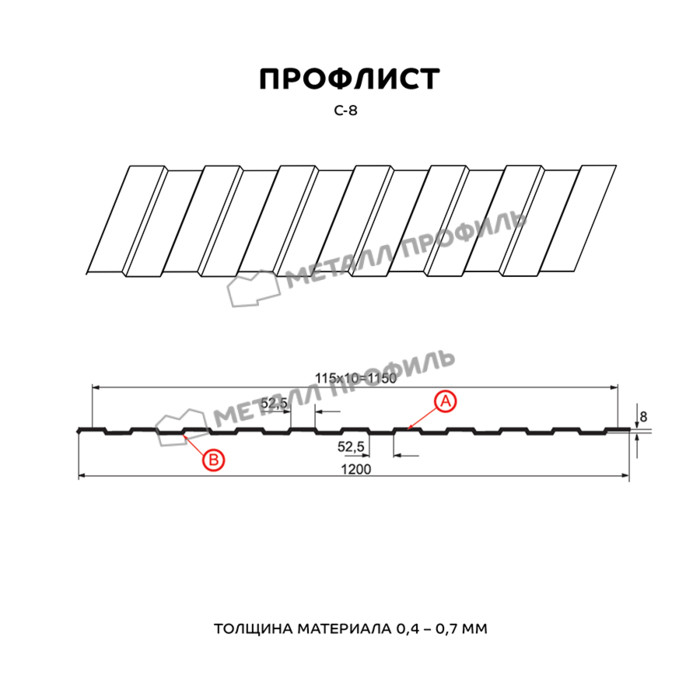 Профилированный лист C-8х1150-A,B является классическим материалом для стен. Этот вид профнастила выпускается компанией «Металл Профиль», и достаточно популярен в сфере строительства. Профнастил данного типа используется для облицовки фасадов промышленных и жилых зданий, а также для строительства стен и перегородок.